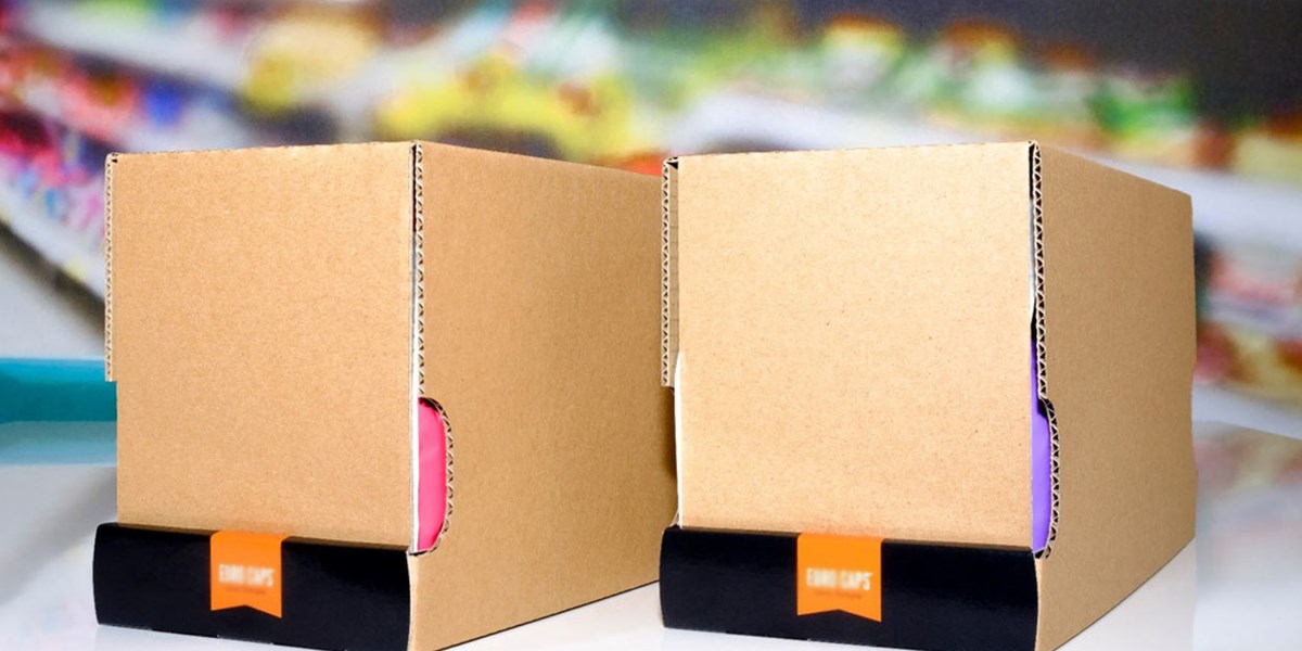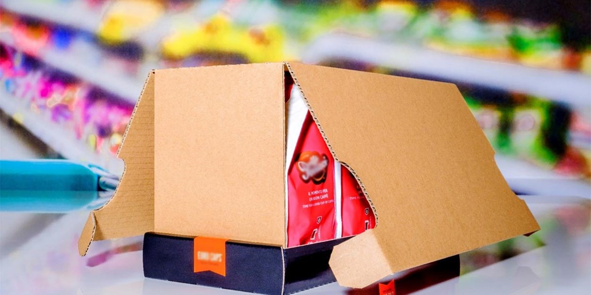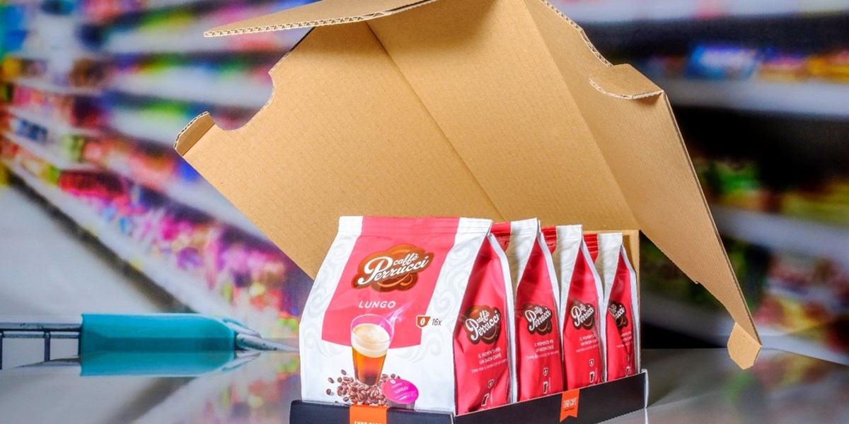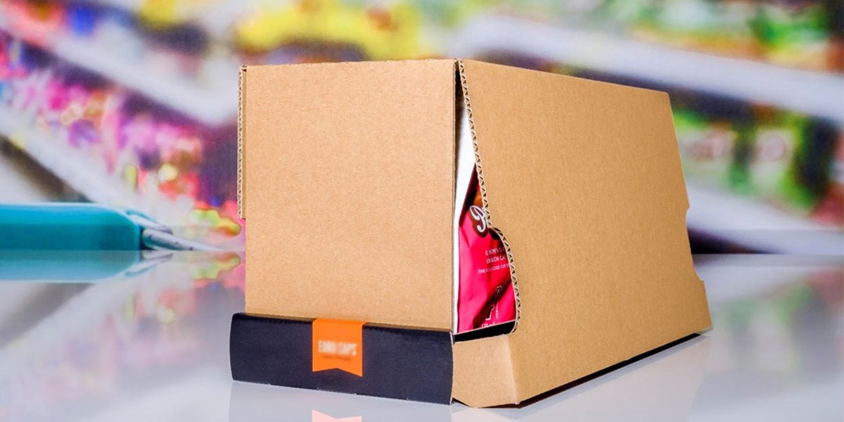 Een Shelf Ready Packaging (SRP) zonder zichtbare perforaties, waarbij de deksel het volledige gewicht draagt. Door de verbinding, zonder lijm of tape, tussen de deksel en de tray kan de SRP, bij het distributiecentrum opgetild worden door een automatisch vacuümtransport systeem.